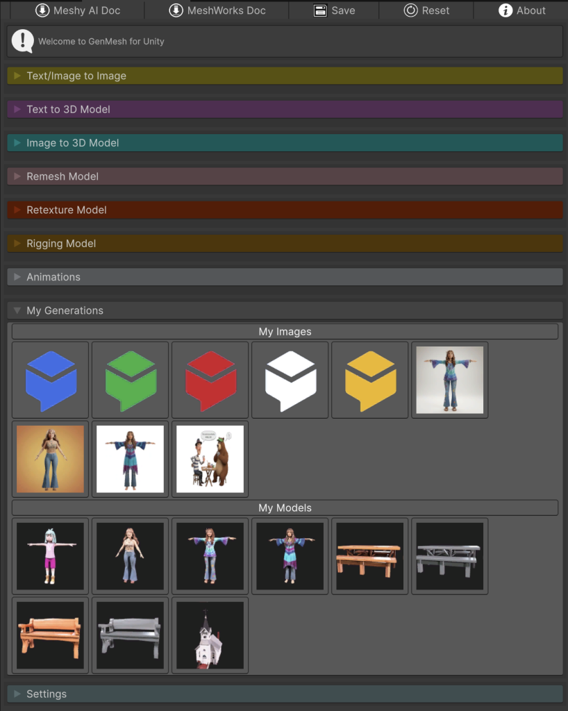 Above, we see an Editor Scroll View with Seven Generation Buttons and two administrative buttons (My Generations and Settings). Along the Top, we see links to Meshy AI and MeshWorks Documentation and three buttons to manage the user’s preferences.